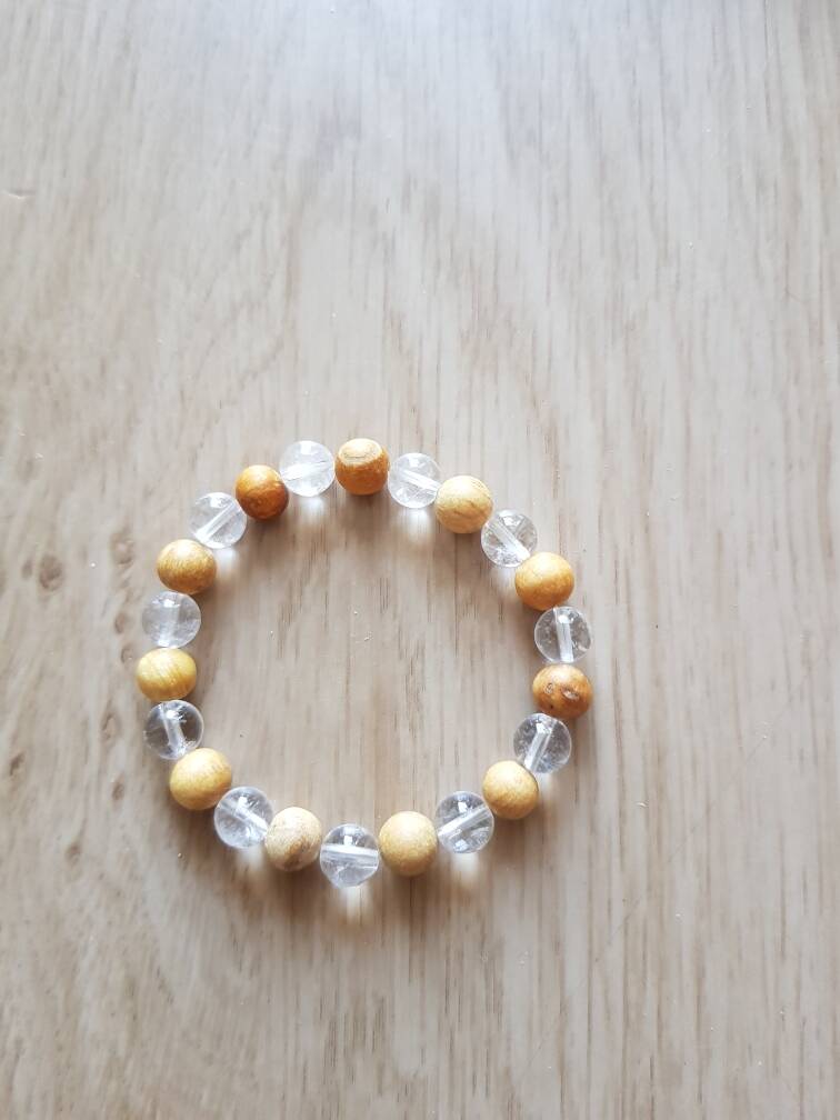 Elastische armband met duurzaam geoogste Palo Santo kralen (± 8 mm) uit Peru, en natuurlijke bergkristal kralen.